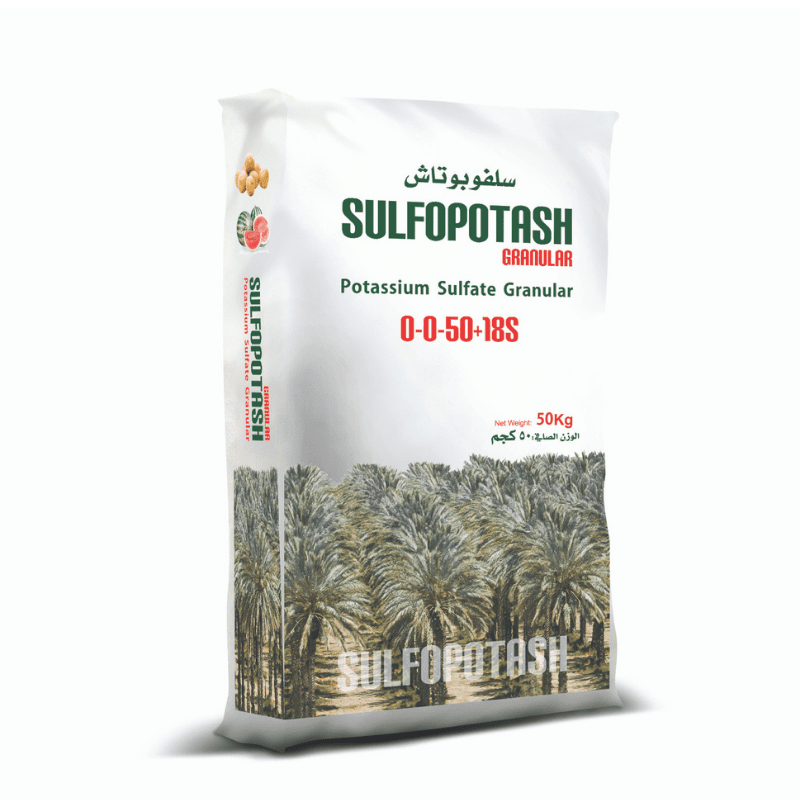 • SULFOPOTASH : Potassium fertilizer is completely free of chloride, as it does not exceed 0.5%, which makes it one of the best types of potassium fertilizers that are soluble for fertilization in local soils, as well as for fertilizing crops sensitive to salt such as: potatoes, citrus fruits, grapes, berries and others.