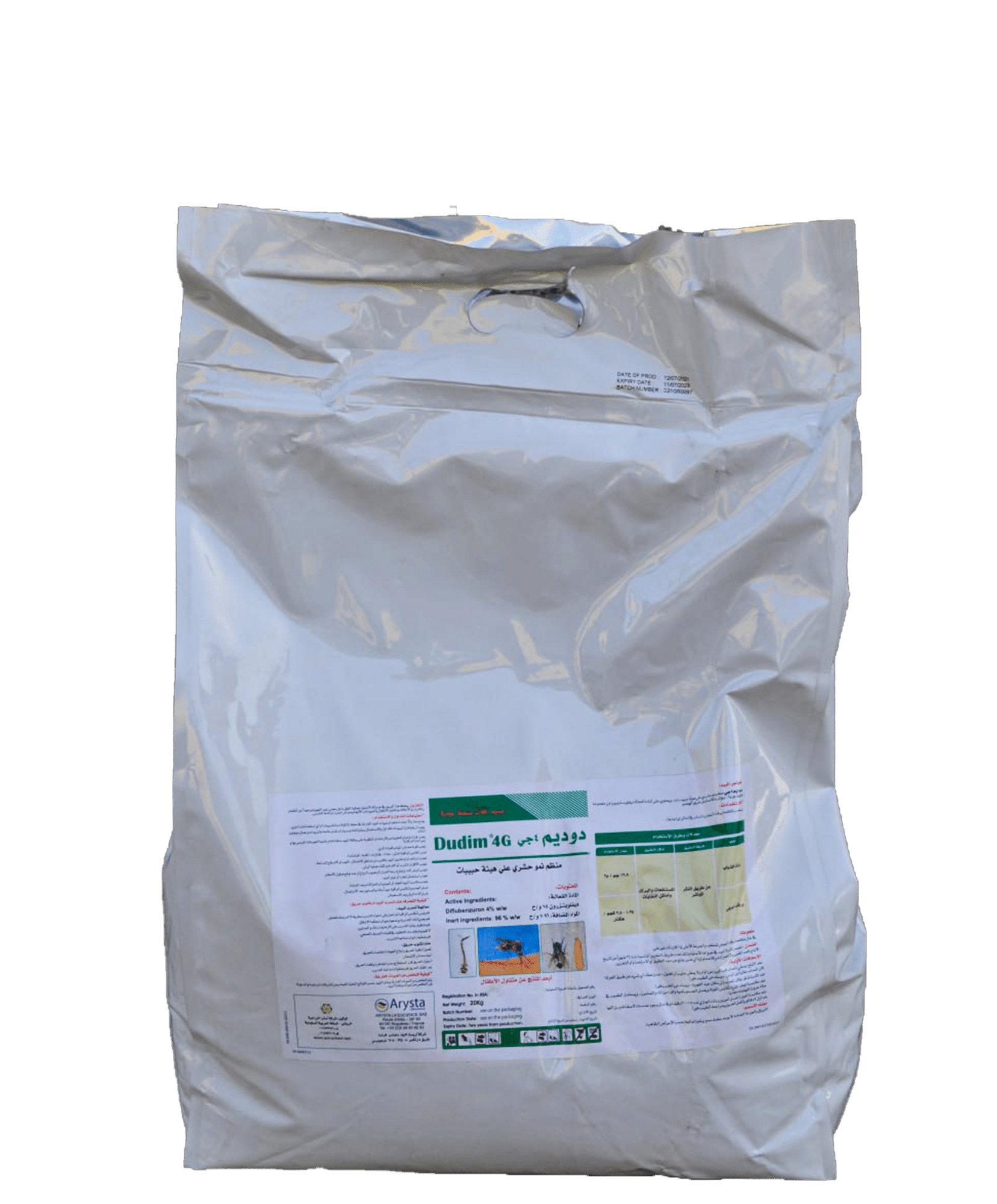 دوديم 4 جي منظم نمو حشري على هيئة حبيبات جاهزة للاستخدام بدون تخفيف يحتوي على المادة الفعالة دايفلوبنزورون 4% تستخدم لمكافحة يرقات البعوض والذباب حيث تؤثر عل تكوين كايتين الحشرة مما يؤدي الى فشلها بالانسلاخ .