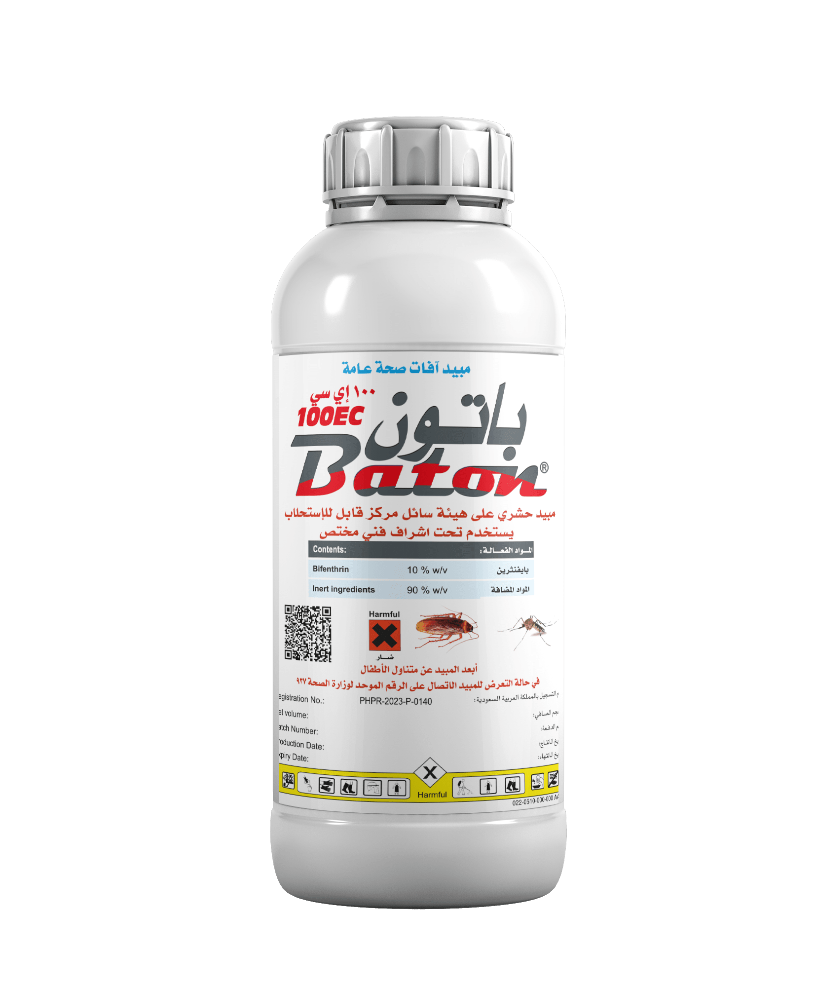 باتون 100 اي سي : مبيد بايرثرويدي لمكافحة افات الصحة العامة خصوصا البعوض والصراصير يحتوي على المادة الفعالة شديدة الفعالية بايفنثرين 10% والمجهزة بصورة مستحلب مركز .